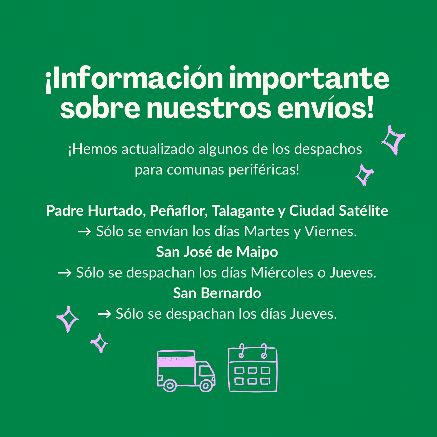 Es importante considerar que para las comunas más alejadas, existen días específicos en los que se despachan los pedidos. Consultar más al respecto si vives en algunas de las comunas periféricas de la Región Metropolitana.
