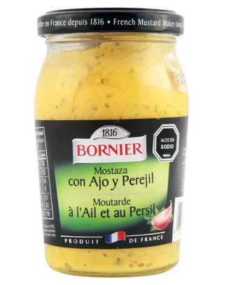 Mostaza tradicional francesa, con el intenso y delicado sabor de la mostaza tipo dijon, aromatizada con ajo y perejil, ideal para cocinar carnes y pescados o para preparar salsas y vinagretas